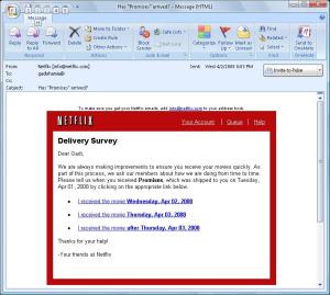 Netflix mastered the idea of getting a lot of information by asking one question at a time, and make it very easy to answer. See how Netflix measures speed of delivery: One question, embedded in an e-mail so you don’t even have to follow a link in order to respond. I have no data about the response rate for Netflix surveys but it must be very high given the extreme ease of use.